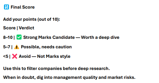 In investing, the biggest risk is not knowing where you are in the cycle. This Howard Marks-inspired scorecard is designed to help you think in probabilities, manage downside, and stay rational when others lose their heads. Built for investors who want to survive—and thrive—through the market's ups and downs.